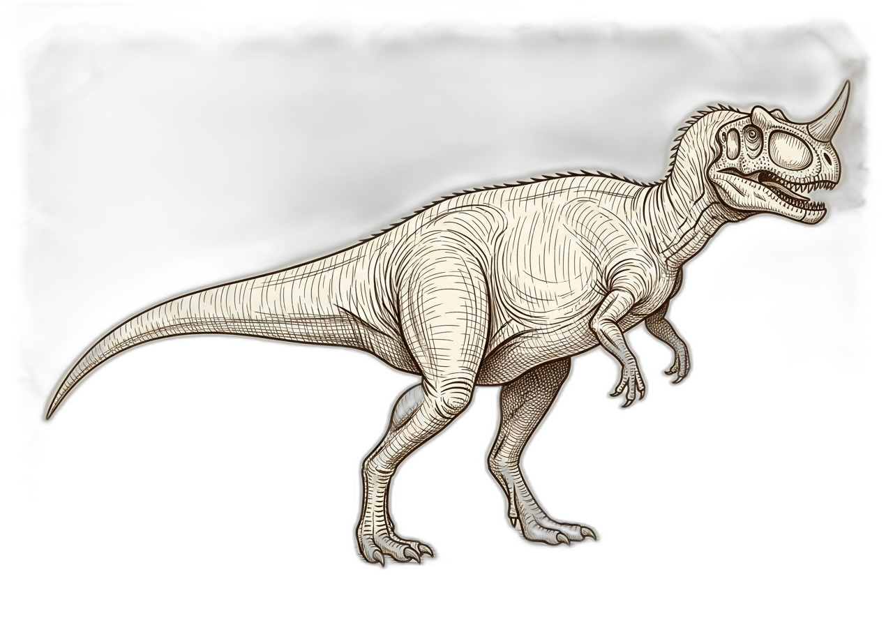 Ceratosaurus was a medium-sized dinosaur instantly recognizable by the prominent horn on its snout and the two smaller horns above its eyes. This striking predator roamed the floodplains and river valleys of Late Jurassic North America alongside giants like Allosaurus and the massive sauropods that made up much of the available prey. Unlike its larger contemporary Allosaurus, Ceratosaurus retained several primitive features, including a more flexible tail and a row of small bony running down its back—a trait rarely seen in large theropods.