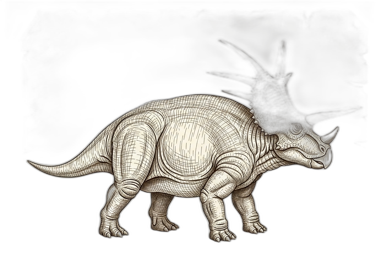 Like other ceratopsians, Styracosaurus was built for a life of low browsing, with a powerful beak for cropping tough vegetation and rows of shearing teeth for processing plant material. It walked on four sturdy legs, with the front limbs slightly shorter than the rear, giving it a distinctive posture. These animals likely lived in herds, as suggested by bone bed discoveries containing multiple individuals.
